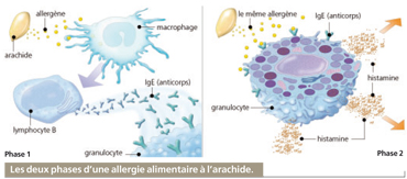 L’allergie alimentaire est une réaction excessive de l’organisme à une substance inoffensive pour d’autres, mais qui déclenche, lors de son ingestion, chez la personne à tendance allergique la production de deux anticorps spécifiques : les immunoglobulines E (IgE) et les lymphocytes B (globules blancs). Les IgE se fixent à la surface des granulocytes basophiles (mastocytes), de grosses molécules du système immunitaire capables de produire de l’histamine, une protéine responsable des réactions allergiques. Lorsque ces systèmes de défense rencontrent à nouveau l’allergène concerné, ils déclenchent la production d’histamine et entraînent différents symptômes.